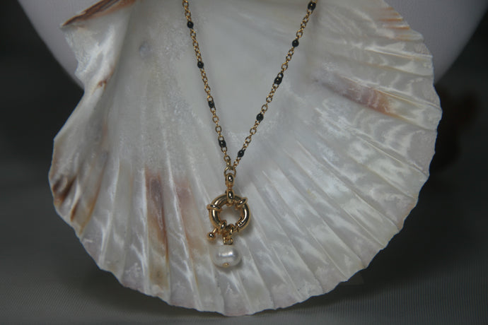 Collier chaine billes dorée et noire avec bouée et perle nacrée - acier inoxydable