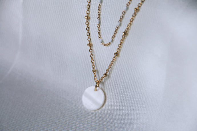 Collier double blanc et doré avec perle plate nacrée - acier inoxydable