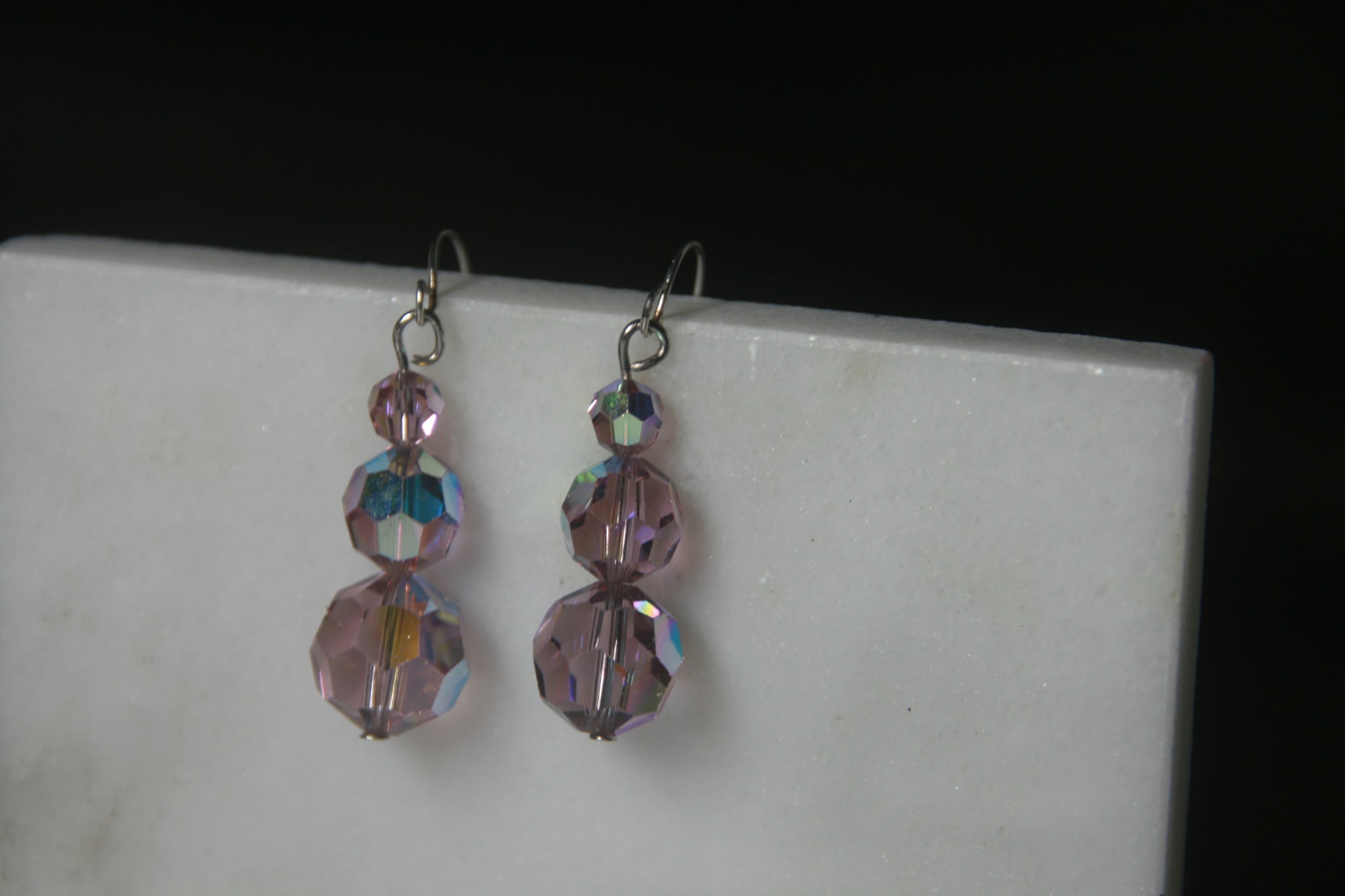 Boucles d'oreilles upcyclées 3 perles à facettes rose-lilas - bijoux upcyclés