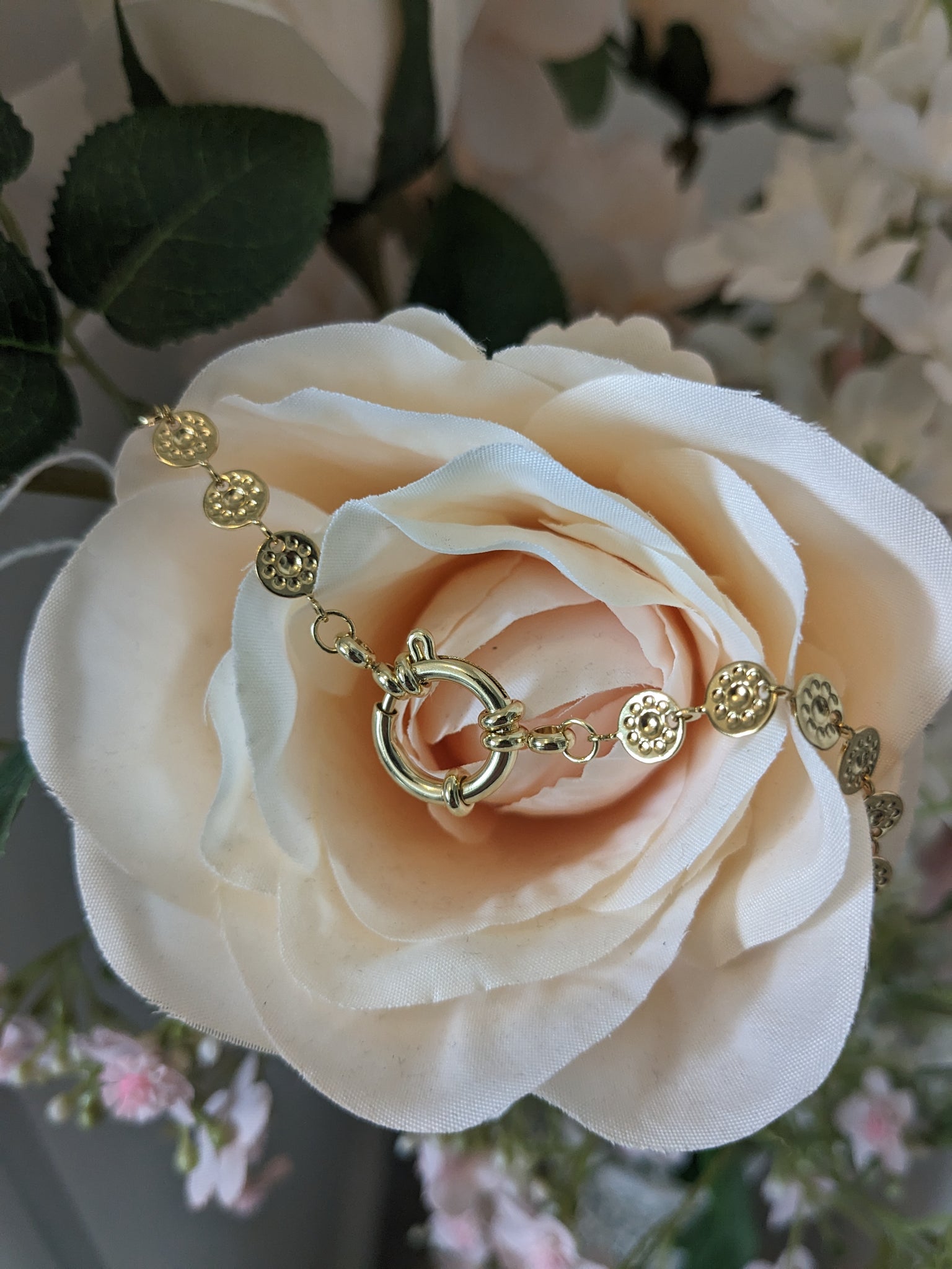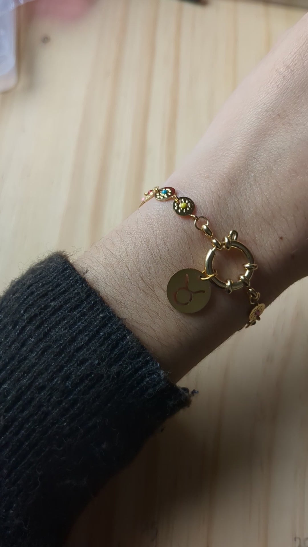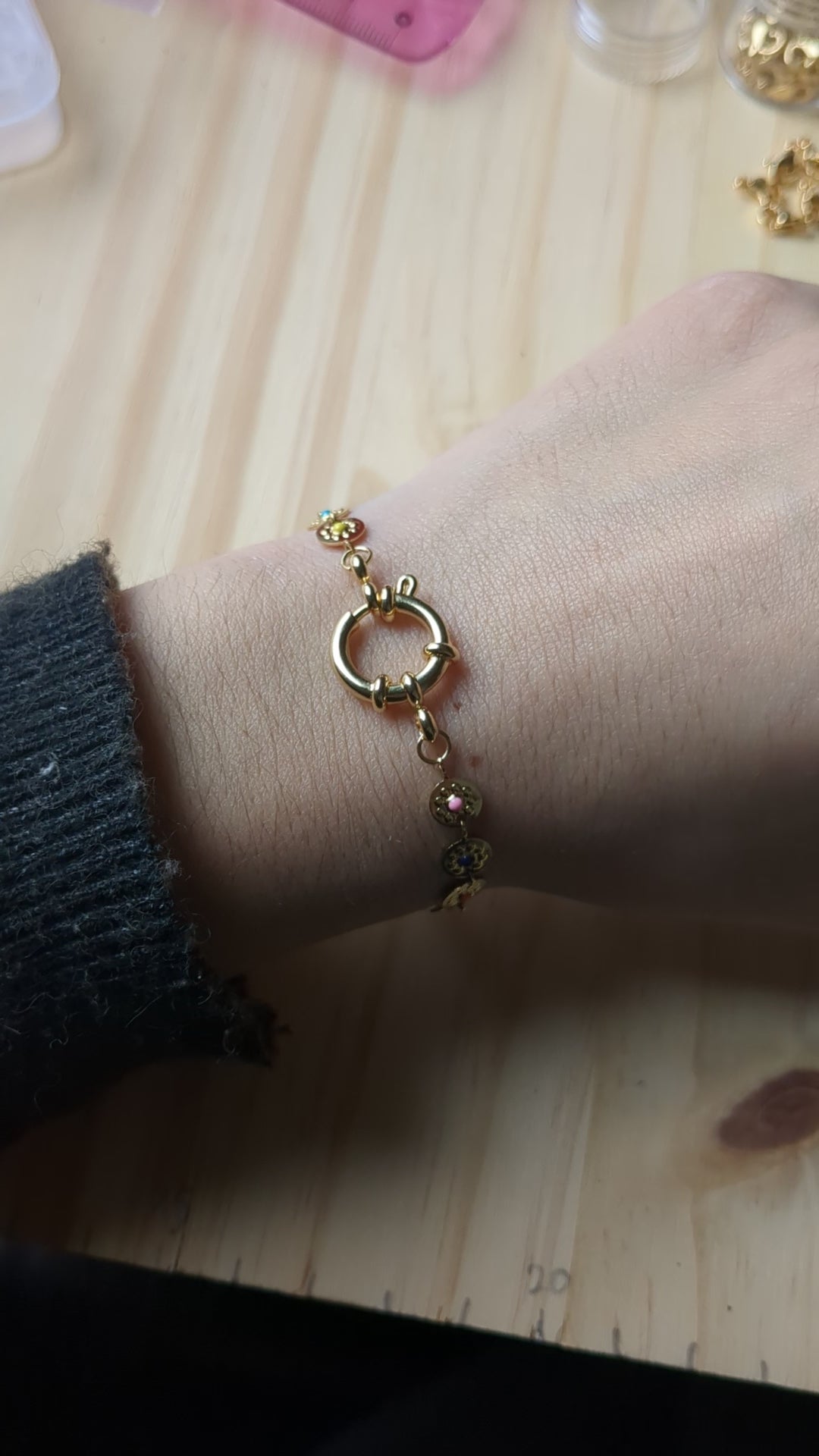 Ce bracelet est réglable grâce à sa chaîne de rallonge, il est réversible c'est a dire que vous pouvez soit porter la face multicolore ou la face dorée 🥰