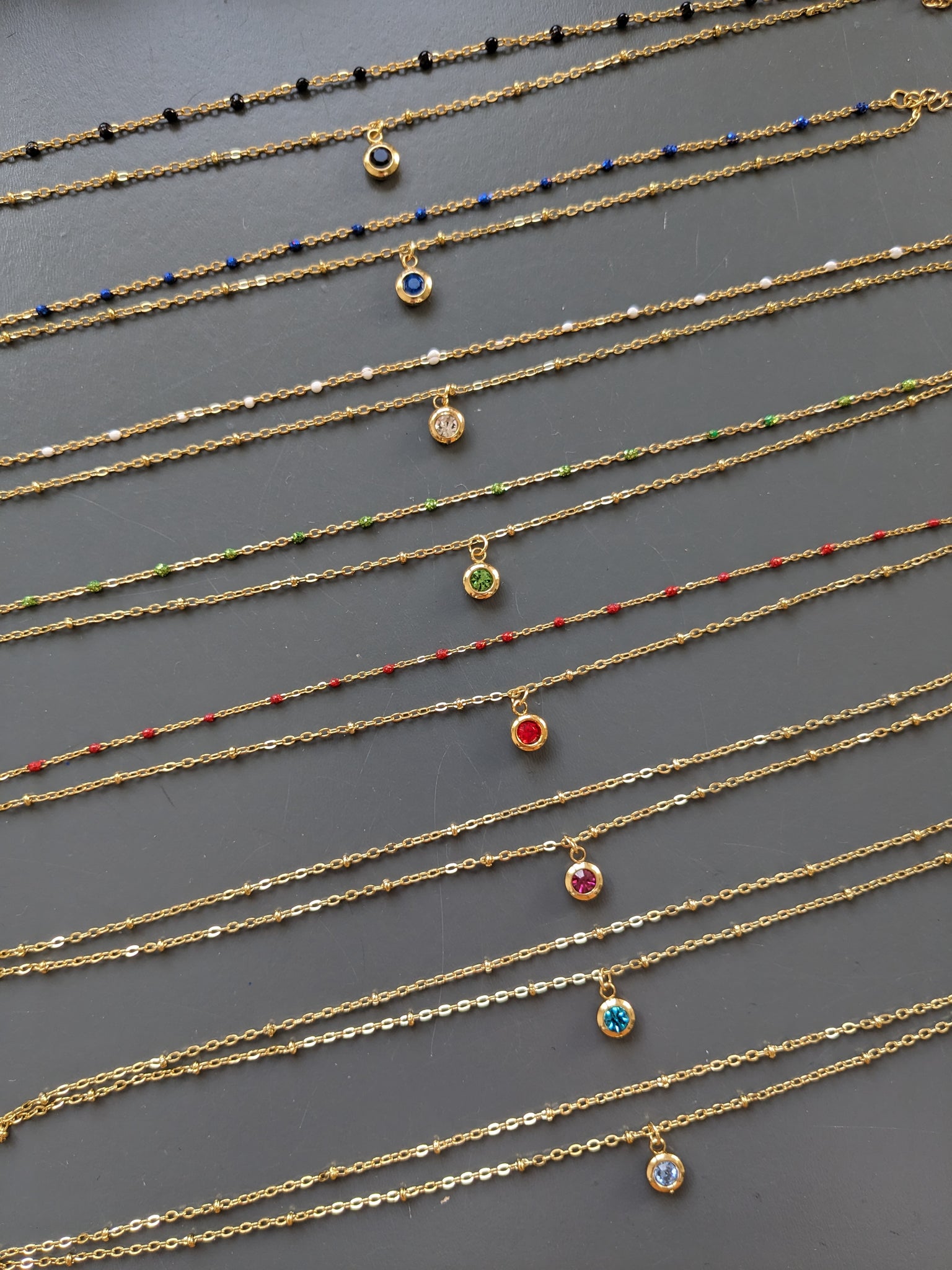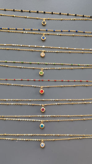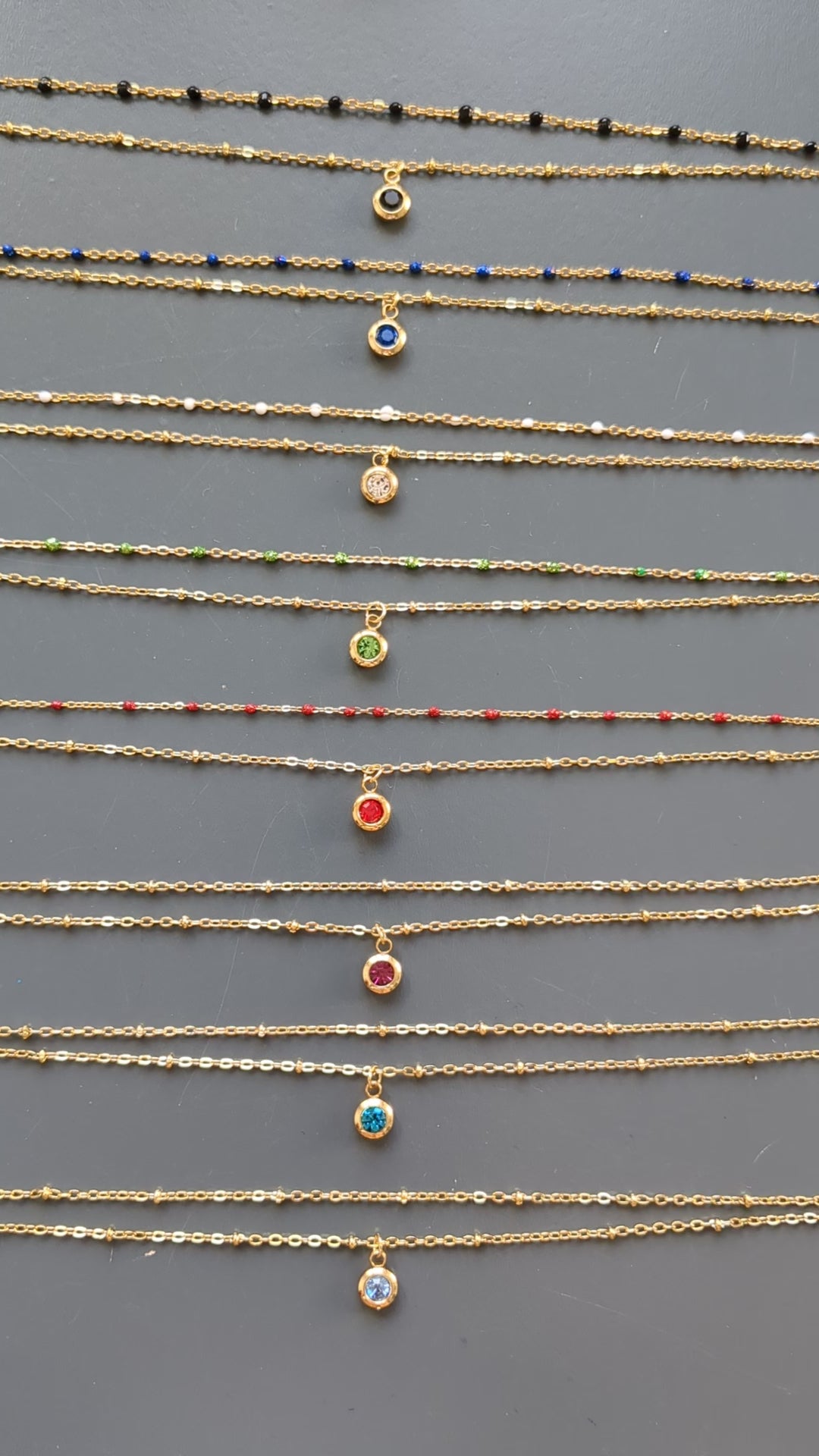 (Cependant, les chaînes colorées ne sont pas toutes disponibles pour chaque couleur de strass c'est pourquoi certaines chaînes sont uniquement dorées avec un strass de couleur.)