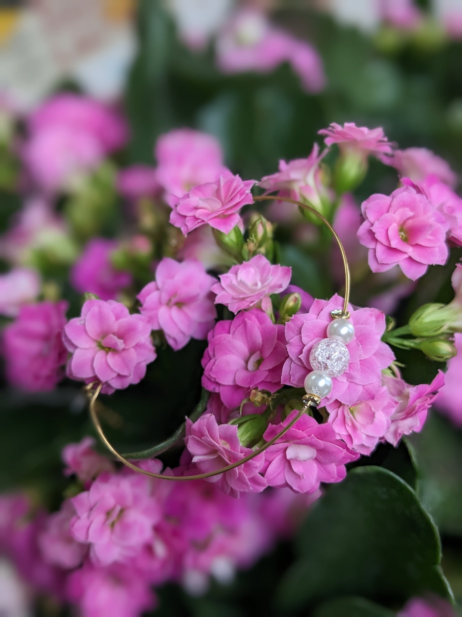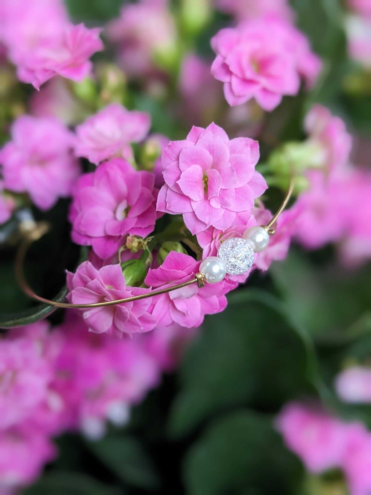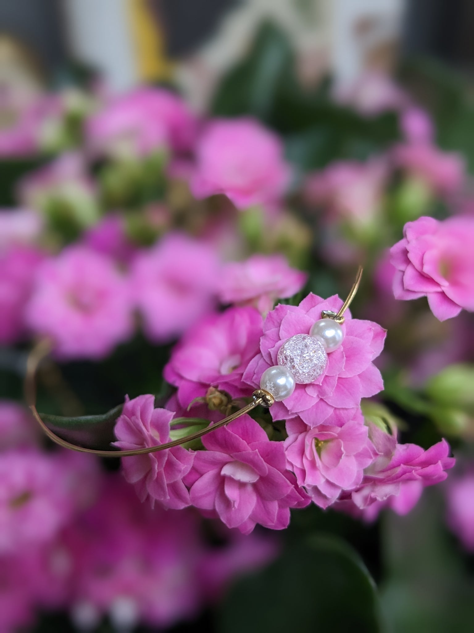 La perle au centre est en verre craquelé et les autres perles sont nacrées.